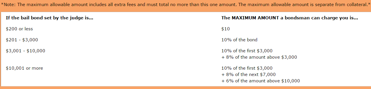 Use this link to find out the maximum amount a bail bondsman can charge as a fee for a specific bond. Any charges above this limit are against the law.